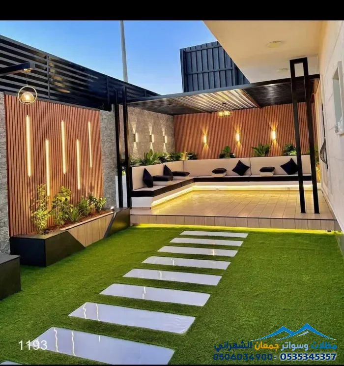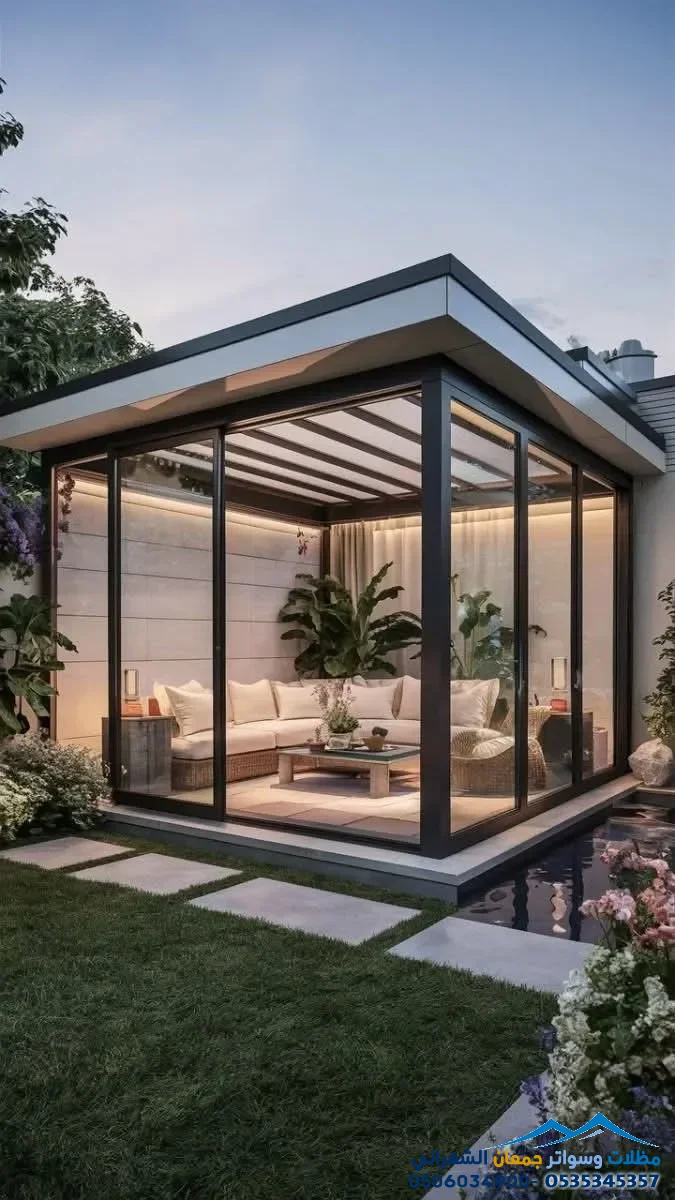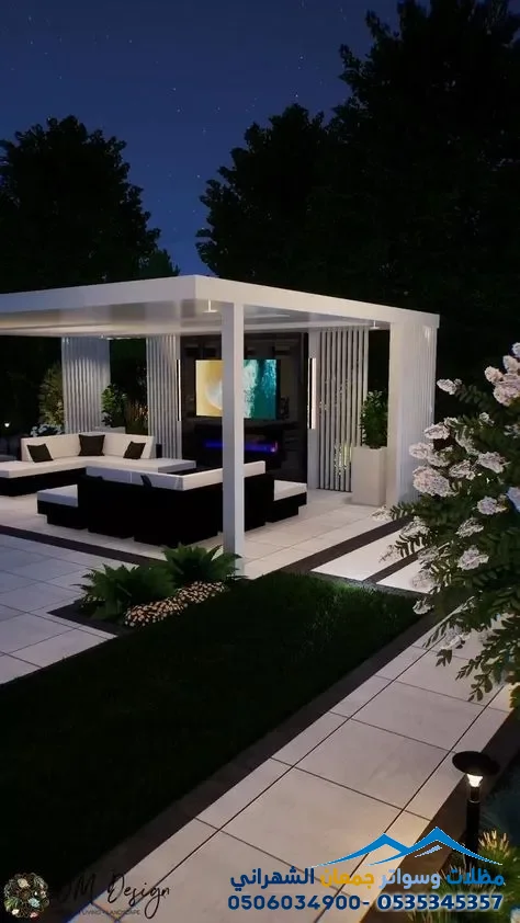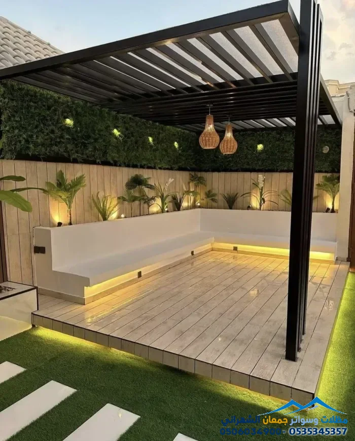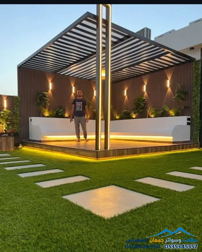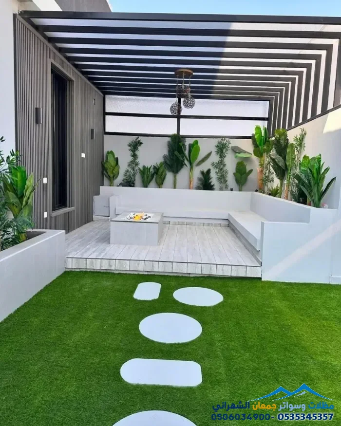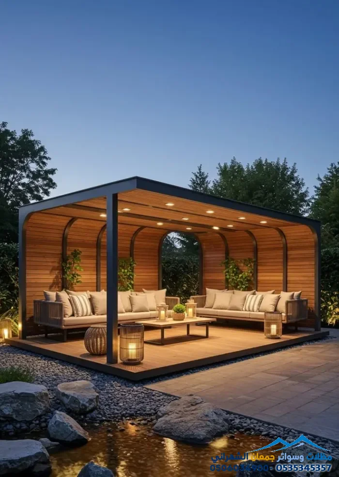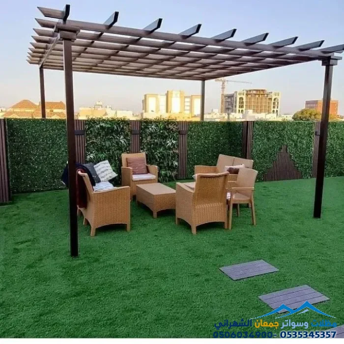 - المظلات (البرجولات): ضع الجلسة تحت برجولة حديد متناسقة معها في التصميم واللون لتوحيد المظهر العام.