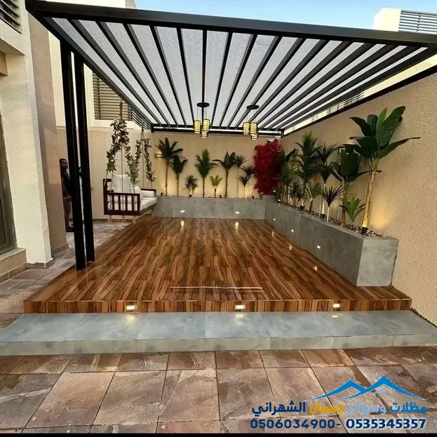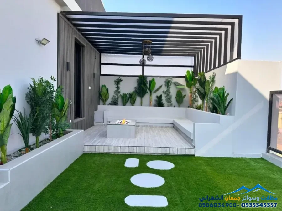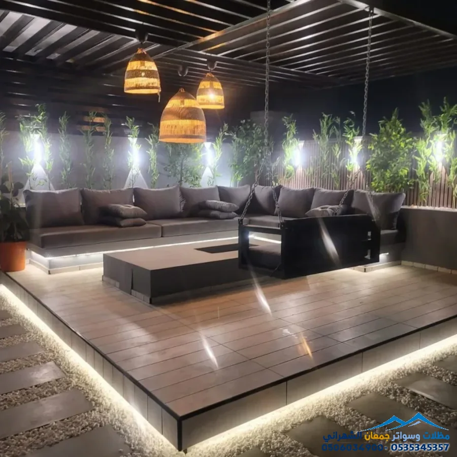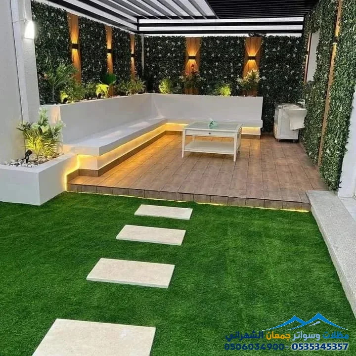 - تغطية الأرضيات: استخدم العشب الصناعي (النجيل) أو خشب "الباركيه الخارجي" (WPC) الذي يتحمل الشمس والمطر.